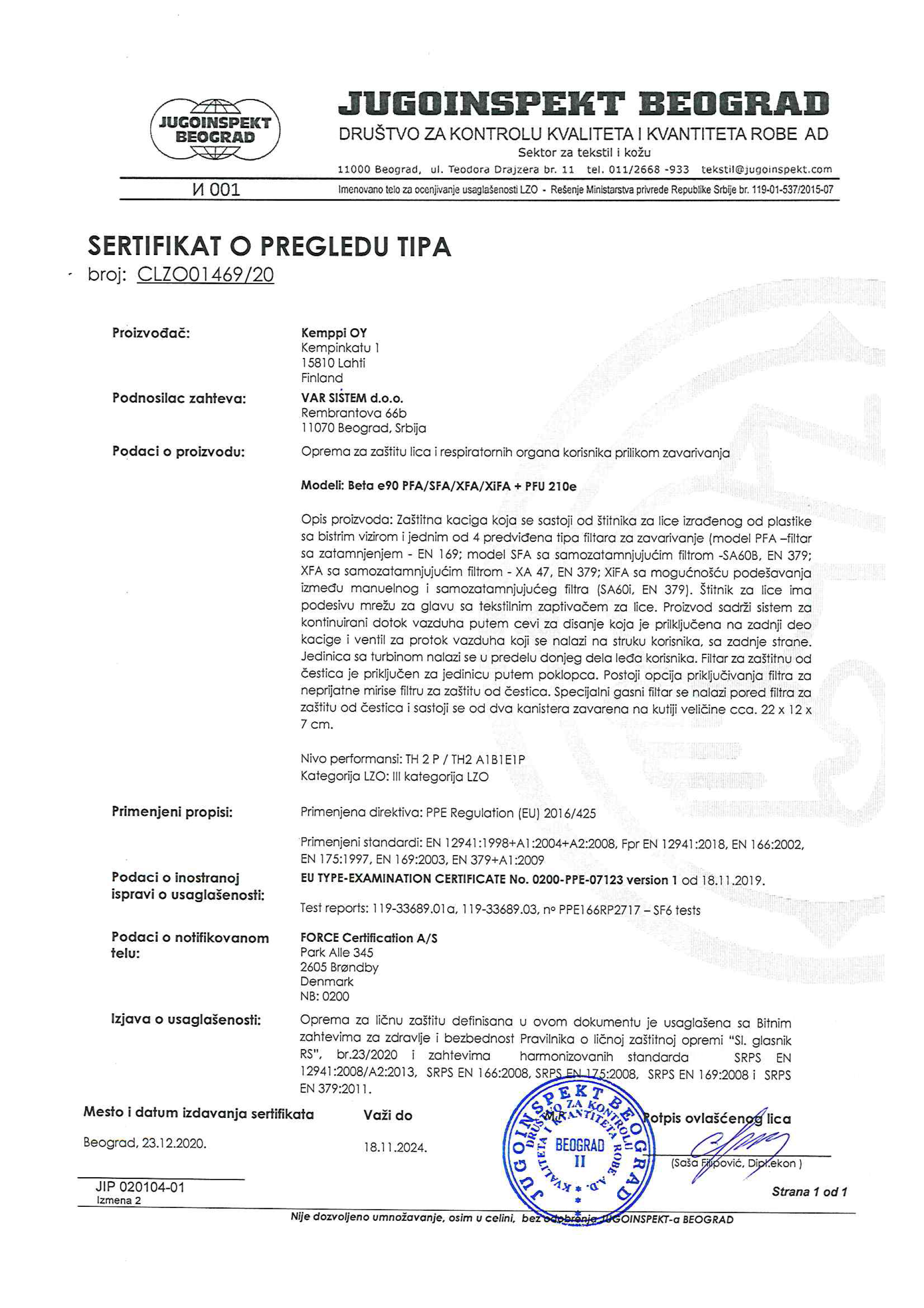 Beta e90 PFA - TH2 PAPR paketi sadrže rešenja za filtraciju čestica i gasa. Pakovanje sadrži Beta e90 XFA kacigu za zavarivanje, 11 nijansno pasivno zavarivajuće sočivo, respirator na napajanje PFU 210e, crevo za vazduh, predfilter, filter za čestice, bateriju 3,2 Ah, punjač akumulatora, merač protoka, kožni kaiš sa udobnim oblogom.